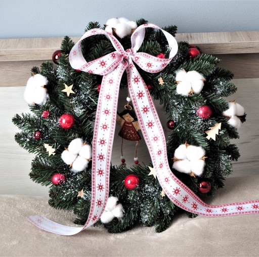 - Nasz świąteczny wianek posiada również piękną, materiałową (bawełnianą) kokardę (jak na zdjęciach) z motywem świątecznym, która dopełnia całość kompozycji.