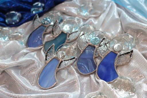 Sukienki aniołków wykonane są z tzw zamkniętego i półzamkniętego szkła witrażowego. Oznacza to że ich barwione w masie kolory przepuszczają światło, ale nie kształty, w związku z tym można je powiesić nie tylko na oknie ale i na ścianie.