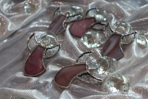 Sukienki aniołków wykonane są z tzw zamkniętego i półzamkniętego szkła witrażowego. Oznacza to że ich barwione w masie kolory przepuszczają światło, ale nie kształty, w związku z tym można je powiesić nie tylko na oknie ale i na ścianie.