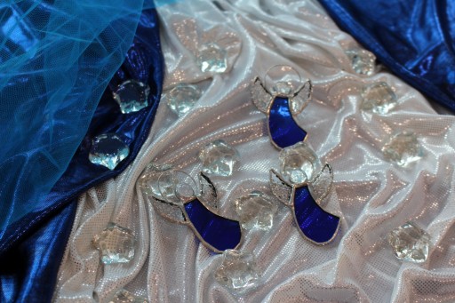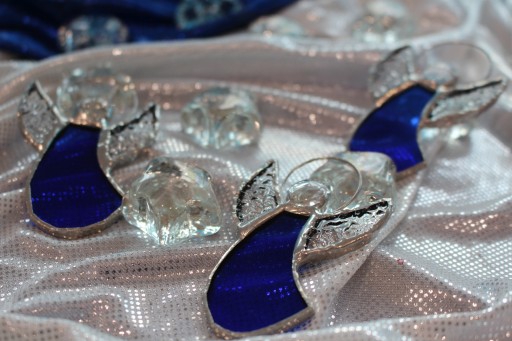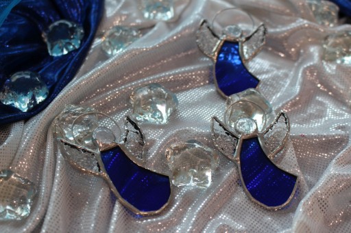 Sukienki aniołków wykonane są z transparentnego szkła witrażowego.
