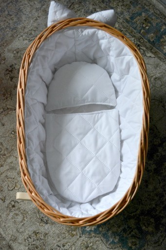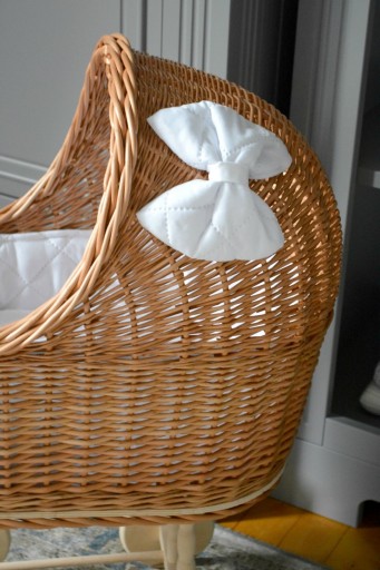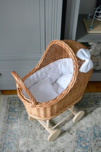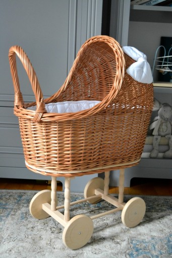 Wózek wiklinowy + kołyska dla lalek kolor naturalny - obszycie materiału białe.