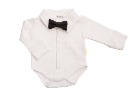 W skład zestawu wchodzi również koszulo body z fantazyjną muszką w takim samym kolorze co garnitur .