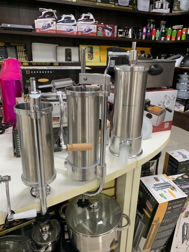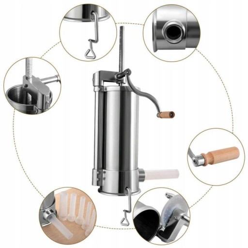 ➡️ Pionowa, ręczna nadziewarka do kiełbas jest świetnym produktem zarówno dla gospodarstw domowych jak i małych masarni. Dzięki niej łatwo przygotujemy różne rodzaje kiełbas, napełniając osłonki wędliniarskie mięsnym farszem. W komplecie z nadziewarką znajdują się 3 lejki o różnych średnicach.
