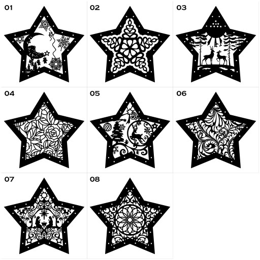 Przód gwiazdy wykonany jest z półprzepuszczalnej kalki dzięki czemu oświetlenie jest bardzo miękkie, dodatkowo boczne ścianki posiadają wycięcia dzięki czemu oświetlenie widoczne jest również na bokach.