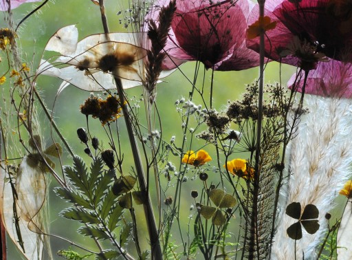 Dekoracyjny witraż z kompozycją z suszonych roślin wykonany w całości w pracowni rękodzieła MARIAELA.