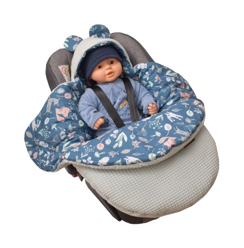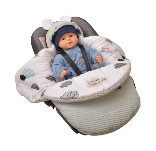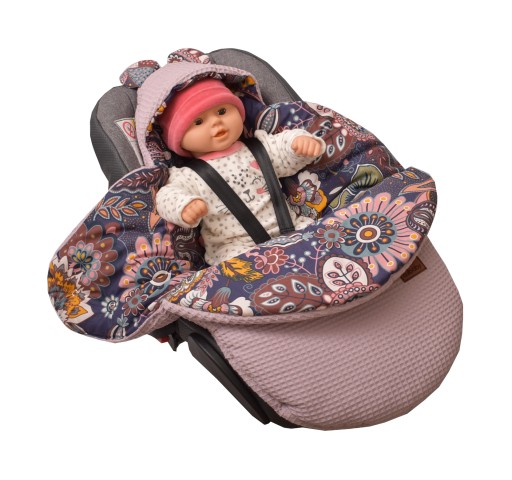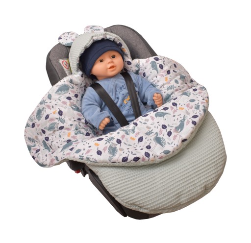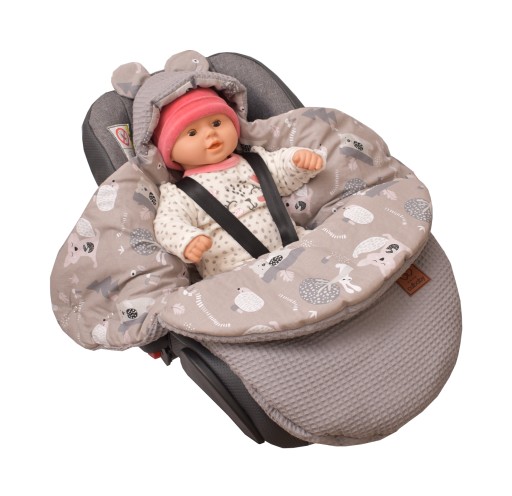 Śpiworek przystosowany jest do fotelika, gdyż posiada otwory na 3 oraz 5 punktowe pasy bezpieczeństwa.