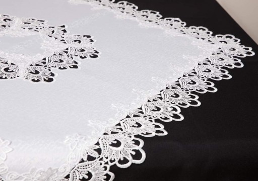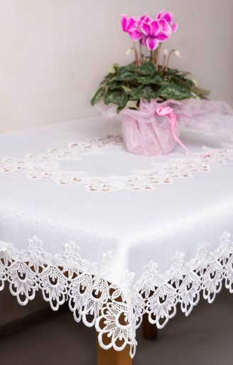 Obrusy wykonane są z wysokiej jakości tkaniny poliestrowej o właściwościach plamoodpornych z doszywana koronką gipiurową.