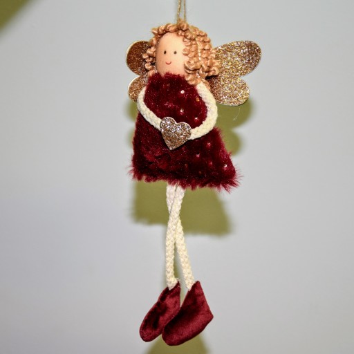 Biała zawieszka w kształcie aniołka ze srebrnymi brokatowymi skrzydełkami stanowić będzie piękną ozdobę choinkową.