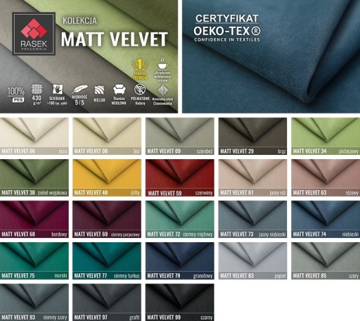 Tkanina - MATT VELVET - puszysta tkanina meblowa wyjątkowo miękka i przyjemna w dotyku. Odporna na ścieranie tkanina tapicerska, bardzo wytrzymała, mocna, jednocześnie bardzo miękka i przyjemna w dotyku