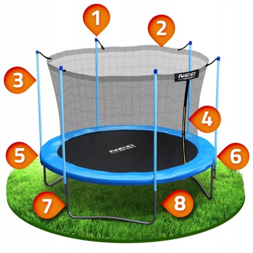 - w zestawie: trampolina ogrodowa, siatka zabezpieczająca, metalowa drabinka, instrukcja obsługi