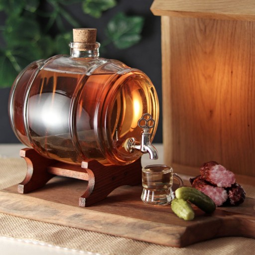 Przepiękna BEZBARWNA szklana beczka z kranikiem o pojemności 2L na nalewki, bimber lub inne alkohole