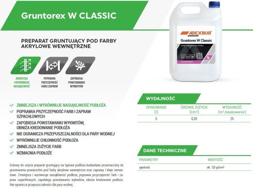 Gotowy do użycia preparat gruntujący na typowe podłoża budowlane. Zmniejsza i wyrównuje nasiąkliwość podłoża, poprawia przyczepność farb i zapraw szpachlowych, zapobiega powstawaniu wykwitów, obniża kredowanie podłoża. Nie ogranicza przepuszczalności dla pary wodnej. Nie zawiera rozpuszczalników.