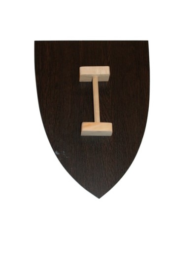 Tarcza drewniana wykonana z płyty meblowej z drewnianą rączką do trzymania.