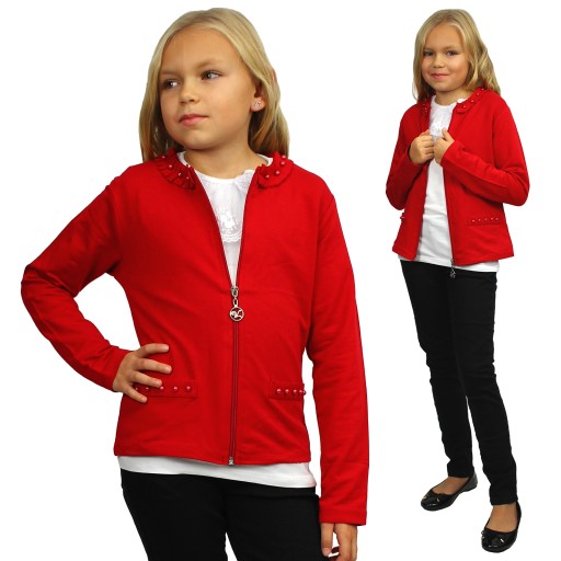 - kołnierzyk dookoła przeszyty fantazyjną dzianinową tasiemką, z przodu dodatkowo ozdobiony czerwonymi perełkami