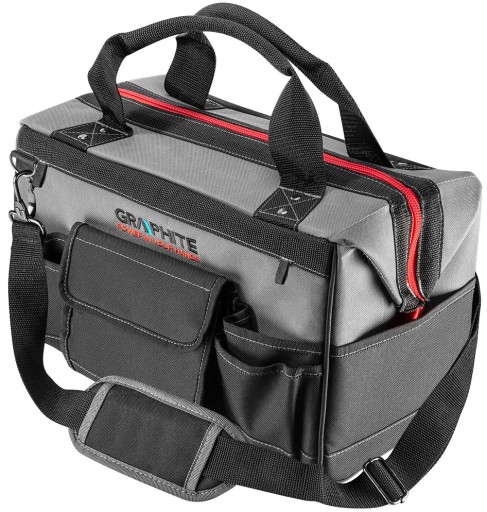 - Średnia torba na elektronarzędzia o pojemność 18,5L, wyposażona w 8 kieszeni wewnętrznych, 2 wewnętrzne zaczepy na narzędzia i 7 kieszeni zewnętrznych.