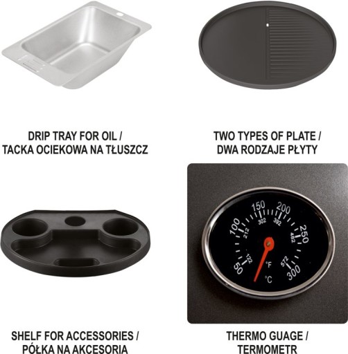 - dwa rodzaje płyty - połowa płyty płaska, połowa ryflowana. Po środku kanał ułatwiający zlewanie tłuszczu do tacki ociekowej