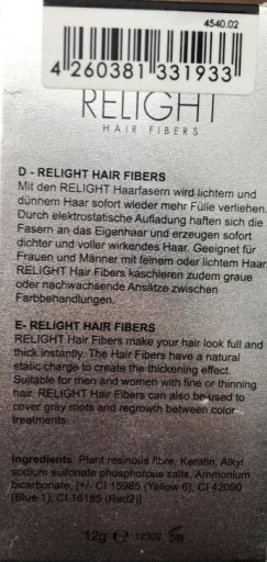 Włókna zagęszczające włosy Relight zapewniają zupełnie nowy wygląd w ciągu zaledwie kilku sekund. Wyjątkowa receptura oparta na czysto ziołowych składnikach daje wyjątkowo naturalny i niepozorny efekt. Dzięki naładowaniu elektrostatycznemu włókien włosa przylegają do własnych włosów i sprawiają, że wyglądają one naturalnie i gęsto .