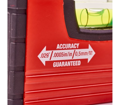 Mini poziomica pomimo tego, że jest narzędziem kompaktowym gwarantuje bardzo wysoką precyzję. Zapewnia dokładność do 0.029° (0.0005 ″/in, 0.5 mm/m), która nie pogarsza się z biegiem czasu. Wybierając ten sprzęt, otrzymujesz gwarancję dożywotniej dokładności potwierdzoną certyfikatem VPS - wydanym przez niemiecki, niezależny instytut. To pewność, że wszystkie wykonane przez Ciebie pomiary będą zgodne z przyjętymi normami, a poziomica będzie służyła Ci długie lata.