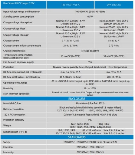 Ładowarka Blue Power IP65 używa specjalnego algorytmu ładowania dla akumulatorów Li-ion (LiFePO4), z automatyczną ochroną podnapięciową po resecie.
