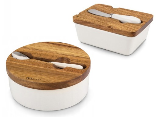 - Maselniczkę porcelanową z pokrywką z drewna akacjowego oraz nożykiem ze stali nierdzewnej