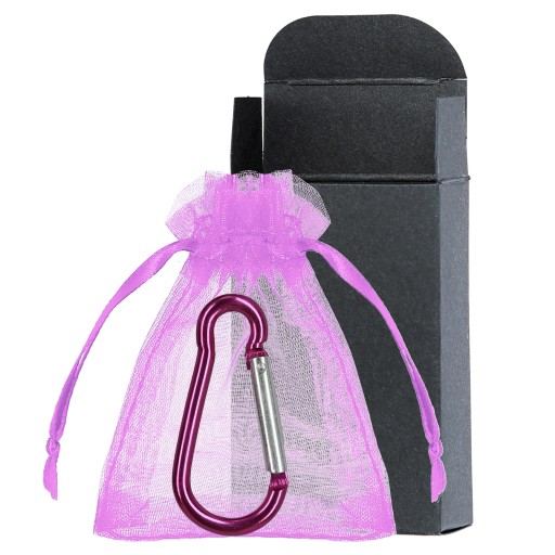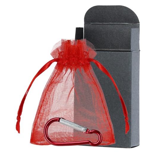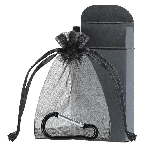 Domyślnie wysyłane jest zestaw z pomarańczową torebką, pomarańczowym karabińczykiem i czarnym pudełkiem.