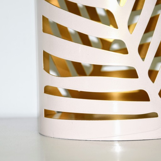 Matowy jasnoróżowy lampion, w środku złoty, z pięknym wycięciem przypominającym liść.