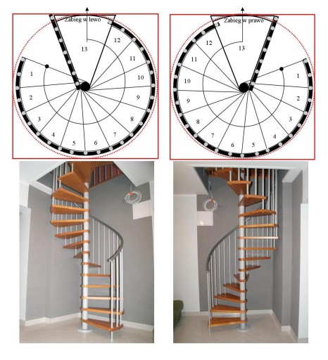 zabieg schodów: lewoskrętny lub prawoskrętny patrząc od pierwszego stopnia