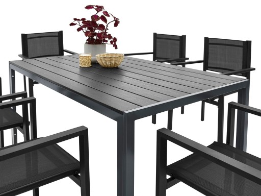 Konstrukcję stołu stanowi wysokiej jakości aluminium, malowane metodą proszkową. W oferowanym zestawie blat stołu wykonany jest z nieabsorbujących wody desek kompozytowych WPC, używanych między innymi do produkcji nowoczesnych systemów tarasowych i elewacji. Najważniejszym elementem konstrukcyjnym stołu są 4 profile aluminiowe w kształcie litery „U”. Ich zastosowanie sprawia, że po zmontowaniu całości stół jest wyjątkowo stabilny! Takie rozwiązanie pozwoliło na uzyskanie wolnej przestrzeni pod stołem i uniknąć niepotrzebnych dodatkowych konstrukcji przeszkadzających w wygodnym korzystaniu z mebli.