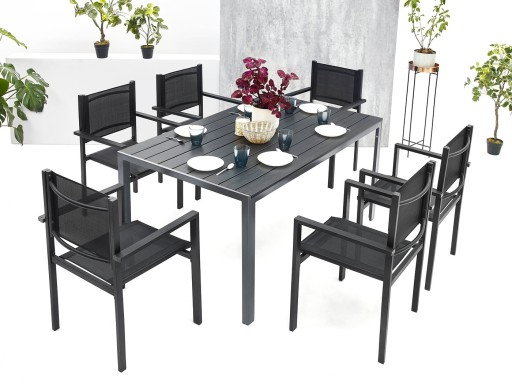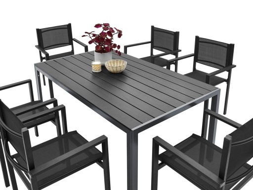 Konstrukcję stołu stanowi wysokiej jakości aluminium, malowane metodą proszkową. W oferowanym zestawie blat stołu wykonany jest z nieabsorbujących wody desek kompozytowych WPC, używanych między innymi do produkcji nowoczesnych systemów tarasowych i elewacji. Najważniejszym elementem konstrukcyjnym stołu są 4 profile aluminiowe w kształcie litery „U”. Ich zastosowanie sprawia, że po zmontowaniu całości stół jest wyjątkowo stabilny! Takie rozwiązanie pozwoliło na uzyskanie wolnej przestrzeni pod stołem i uniknąć niepotrzebnych dodatkowych konstrukcji przeszkadzających w wygodnym korzystaniu z mebli.