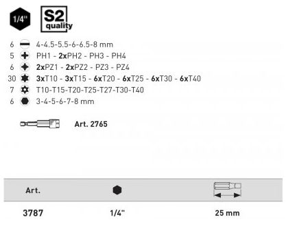 - Bit Torx® 1/4 ": 3x T10 - T15 - 6x T20 - T25 - T30 - T40