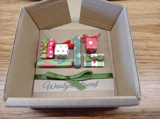 zapakowana w karton o wymiarach 10x10x5 cm kartka 3 D z ręcznie zapakowanymi "prezentami" będzie wyjątkowym dodatkiem do każdego nawet najdrobniejszego prezentu.
