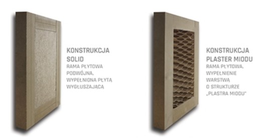 Proponowany model to skrzydło drzwiowe wykonane z ramy MDF wypełnionej płytu wygłuszającą SOLID. Rama wraz z wypełnieniem jest dwustronnie obłożona płytą HDF i oklejona Finish Folią w kolorze drewna.