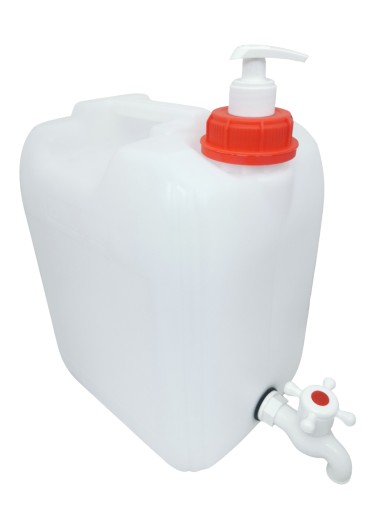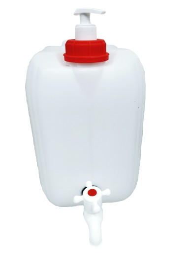 - Umywalka turystyczna (kanister) posiada wmontowany kranik z zaworem kulowym oraz dozowniki na mydło w płynie z pompką