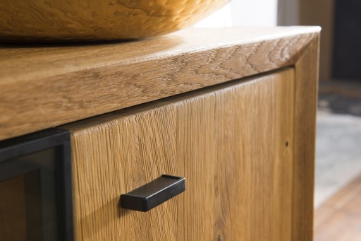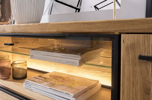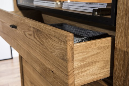 Dobry projekt mówi sam za siebie: brak popisu, przeciążenia optycznego, a jednocześnie imponujący kształt. Vigo to seria mebli która przekonuje wyrazistymi kształtami, dyskretną elegancją i efektownymi dodatkami. Harmonijne połączenie szczotkowanego litego drewna dębowego i spokojnych metalowych akcentów tworzy zmysłowy ogólny wygląd. Niezależnie od tego, czy są to kredensy, panele czy witryny – tutaj możesz projektować w różnorodny i dyskretny sposób. Specjalne szczegóły, takie jak podświetlana ściana tylna, oraz loftowe dodatki ustawiają ten mebel idealnie na ścianie. Model Vigo to spełnienie marzeń o indywidualnym, stylowym wnętrzu z litego drewna – prostym, wyrazistym z dużą ilością użytecznej przestrzeni do przechowywania.
