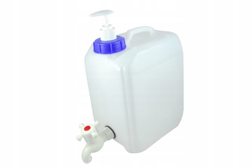 - Umywalka turystyczna (kanister) posiada wmontowany kranik z zaworem kulowym oraz dozowniki na mydło w płynie z pompką