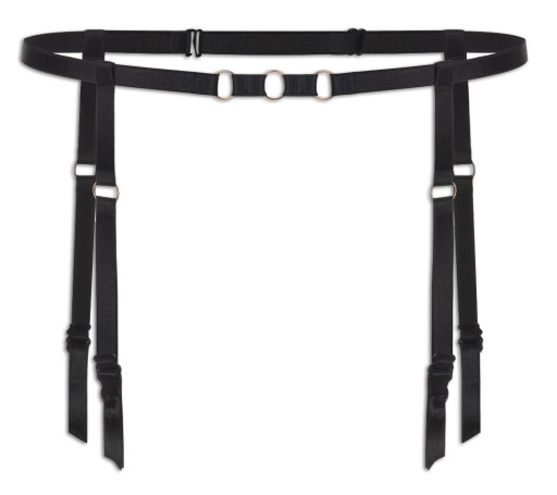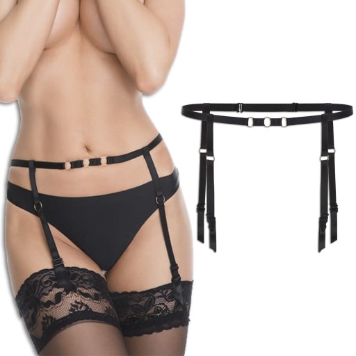 Niezwykle modny, minimalistyczny pas do pończoch wykonany z elastycznych, czarnych taśm. Model ozdobiony jest niewielkimi kółeczkami w kolorze różowego złota. Zapięcie i paski do pończoch są regulowane. Model dostępny jest w rozmiarach S/M oraz L/XL.