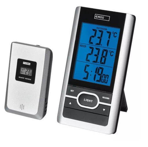 Cyfrowy bezprzewodowy termometr EMOS. Mierzy temperaturę wewnętrzną w zakresie od -9°C do +50°C, oraz temperaturę zewnętrzną od -50°C do +70°C. Umożliwia wybór jednostki pomiarowej z Celsjusza na Fahrenheita. Jest praktycznym wskazaniem trendu temperatury, wyświetlając wartość minimalną i maksymalną oraz posiada nowoczesny i elegancki wygląd. Urządzenie posiada czytelny, duży wyświetlacz (54 × 74mm). Ten praktyczny pomocnik jest wyposażony w bezprzewodowy czujnik o zasięgu do 60 metrów. Oczywiście istnieje możliwość powiszenia go na ścianie. Termometr zasilany jest dwoma bateriami AAA 1,5V a czujnik dwoma bateriami AAA 1,5V. Termometr EMOS zapewni nie tylko podgląd temperatury ale także czasu, a zegar sterowany jest sygnałem radiowym DCF.