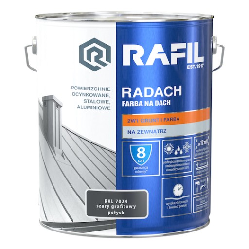 Wysokiej jakości gruntoemalia RADACH FARBA NA DACH przeznaczona jest do ochronno-dekoracyjnego malowania zewnętrznych powierzchni metalowych: stalowych, ocynkowanych i aluminiowych. Farba stosowana jest zarówno do wykonywania nowych wymalowań, jak i renowacji starych powłok malarskich. Charakteryzuje się doskonałą przyczepnością do podłoża. Tworzy szybkoschnące, wysoce elastyczne powłoki o podwyższonej odporności na działanie światła słonecznego, wody i innych czynników atmosferycznych. RADACH FARBA NA DACH zapewnia długotrwały efekt dekoracyjny malowanych powierzchni, a w zestawieniu z Rafil PODKŁAD ANTYKOROZYJNY stanowi silne zabezpieczenie przed korozją.