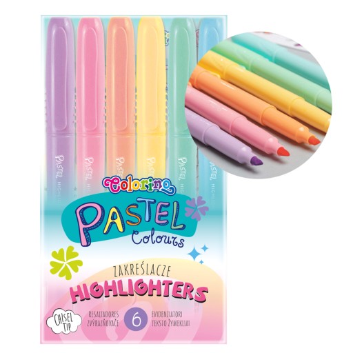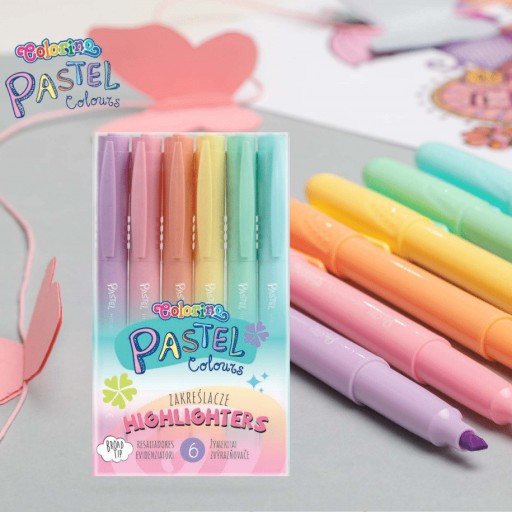 Zakreślacze w 6 pastelowych kolorach sprawdzą się zarówno w szkole, podczas nauki czy odrabianiu lekcji. Urocze pastelowe kolory ozdobią również różnego rodzaju własnoręcznie wykonane kartki, rysunki, ozdoby.