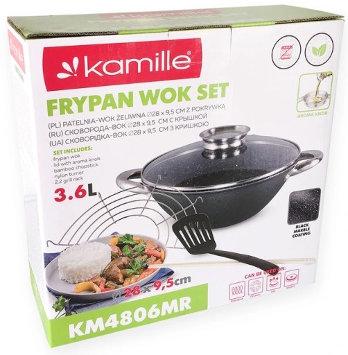 Wok dodatkowo został wyposażony w grillowy ruszt ze stali nierdzewnej, funkcję aromat, teflonową łopatkę i drewniane pałeczki.