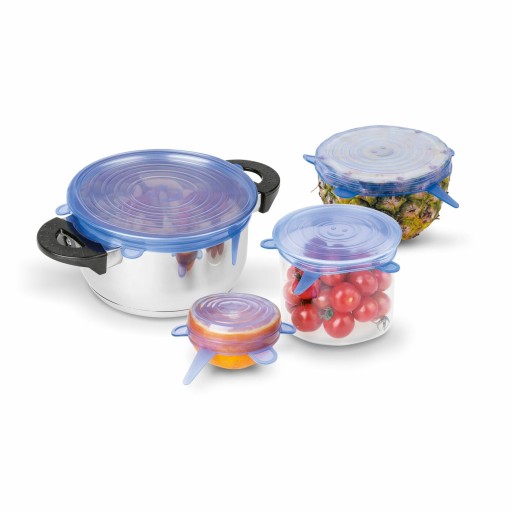 - Silikonowe pokrywki szczelnie przylegają do naczyń zapobiegając wysychaniu żywności, więc przedłużysz jej świeżość
