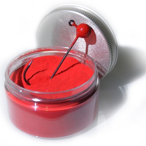 - Ciepłą główkę zanurzamy w proszku po czym szybko wyjmujemy i obtrząsamy nadmiar uderzając haczykiem w rant pojemnika.