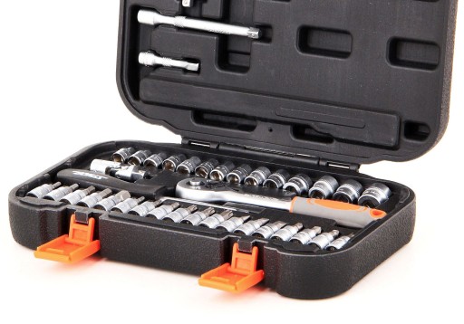 W zestawie znajdziemy pełen zakres nasadek 1/4", bitów, przedłużki, przegub Cardana i grzechotkę o 45 zębach. Taka konfiguracja sprawia, że zestaw znajdzie zastosowanie przy drobniejszych pracach montażowych, przy naprawach mechanicznych oraz wielu innych pracach w gospodarstwie domowym czy warsztacie.