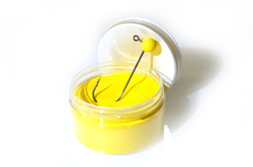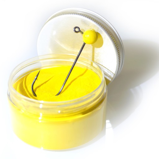 - Ciepłą główkę zanurzamy w proszku po czym szybko wyjmujemy i obtrząsamy nadmiar uderzając haczykiem w rant pojemnika.