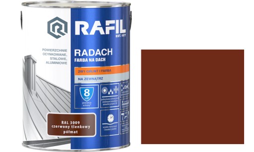 Wysokiej jakości gruntoemalia RADACH FARBA NA DACH przeznaczona jest do ochronno-dekoracyjnego malowania zewnętrznych powierzchni metalowych: stalowych, ocynkowanych i aluminiowych. Farba stosowana jest zarówno do wykonywania nowych wymalowań, jak i renowacji starych powłok malarskich. Charakteryzuje się doskonałą przyczepnością do podłoża. Tworzy szybkoschnące, wysoce elastyczne powłoki o podwyższonej odporności na działanie światła słonecznego, wody i innych czynników atmosferycznych. RADACH FARBA NA DACH zapewnia długotrwały efekt dekoracyjny malowanych powierzchni, a w zestawieniu z Rafil PODKŁAD ANTYKOROZYJNY stanowi silne zabezpieczenie przed korozją.