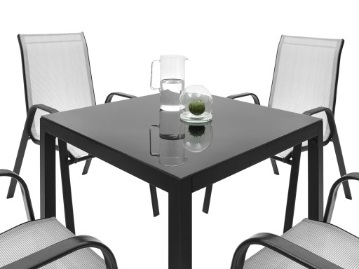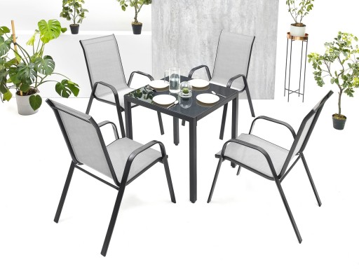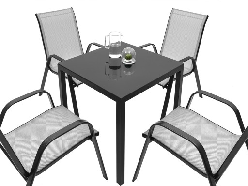ZESTAW MEBLI OGRODOWYCH idealny do Twojego ogrodu. Stelaż został podwójnie lakierowany proszkowo, co idealnie przystosowuje ten produkt do zastosowania wewnątrz jak i na zewnątrz. Siedzisko krzesła oraz oparcie zostało zrobione z jasno szarego, elastycznego obicia tekstylnego tak, aby maksymalnie zwiększyć wygodę. Posiada ono dwa oparcia boczne. Użyte materiały nie wymagają częstej konserwacji, są odporne na warunki pogodowe i nie wymagają specjalnych środków do pielęgnacji. Nóżki są dodatkowo zaopatrzone w nakładki z tworzywa sztucznego. Stół posiada blat z przezroczystej hartowanej szyby o gr. 5 mm.
