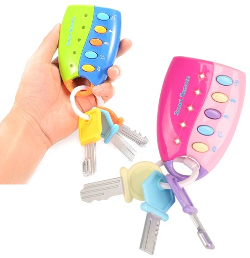 Każdy z nich ma inną zabawną funkcję: dźwięk kluczyka, dźwięk blokady, dźwięk uruchamiania auta, klakson, dzwonek lub melodia.