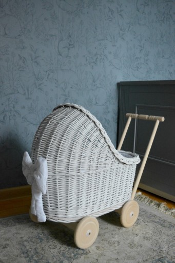Плетеная коляска для кукол, БЕЛАЯ толкалка + постельное белье