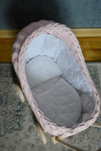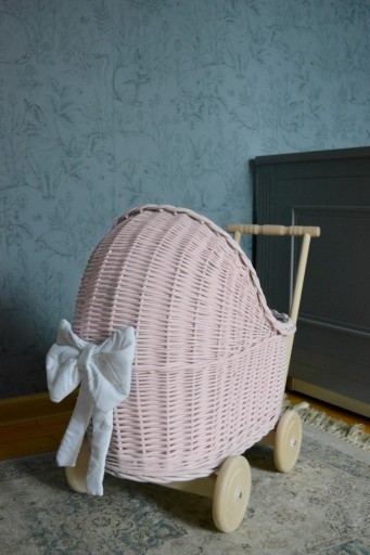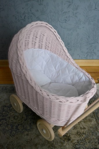 РОЗОВАЯ плетеная кукольная коляска, толкатель + постельное белье