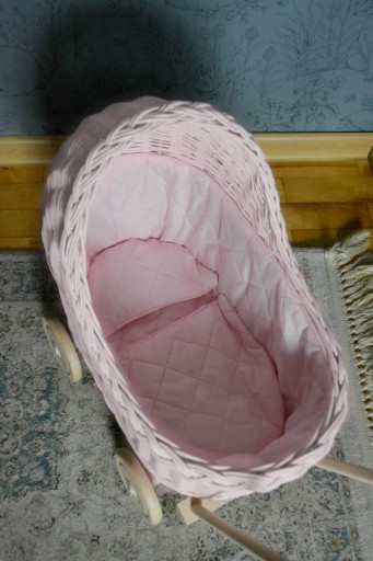 РОЗОВАЯ плетеная кукольная коляска, толкатель + постельное белье